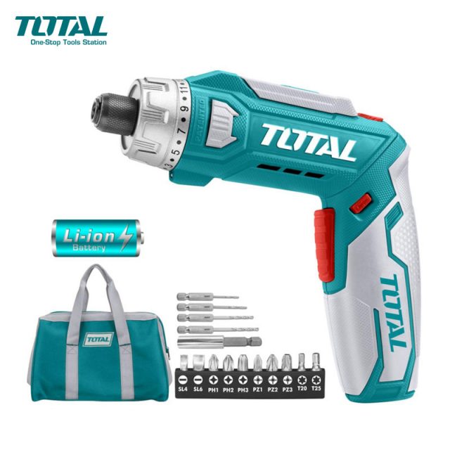 - Incluye cargador, 10 puntas 25mm de Cr-V, 1 soporte de broca magnética, 4 brocas HSS con vástago hexagonal y bolso transportador